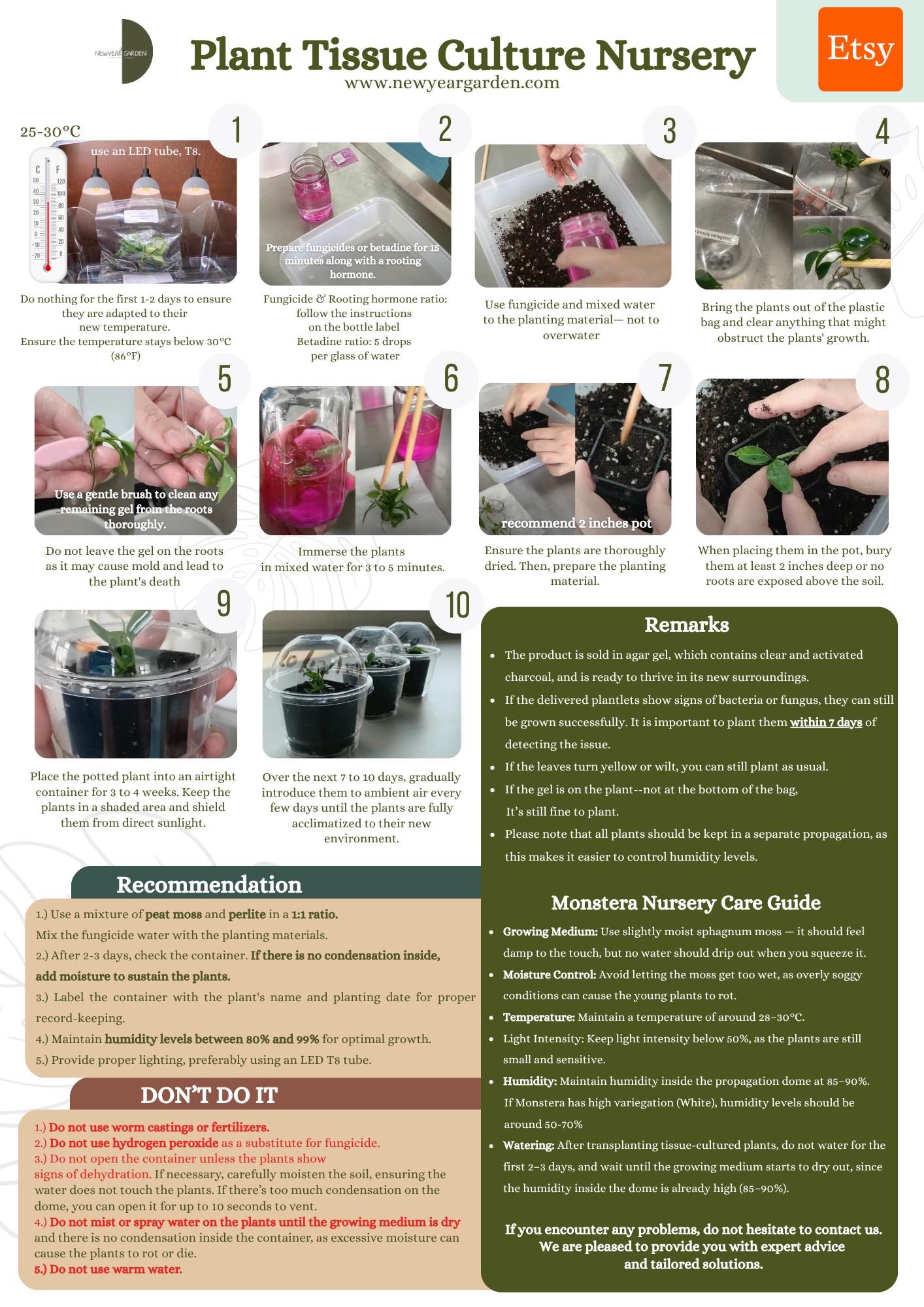 The customer is responsible for ensuring proper acclimation of the plantlets. If you have any questions about the process, we are willing to help. However, Newyear Garden Lab is not responsible if any plantlets fail to survive. By purchasing this product, you agree to these terms.